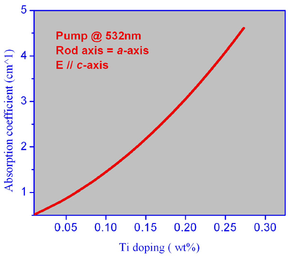 Ti:Sapphire crystal is the most widely used tunable solid-state laser material combining the supreme physical and optical properties with the extremely broad lasing range.  Its lasing bandwidth can support pulses < 10fs making it the crystal of choice for femtosecond mode-locked oscillators and amplifiers.  The absorption band of Ti:Sapphire centers at ~ 490 nm so it may be conveniently pumped by various laser sources such as argon ion lasers or frequency doubled Nd:YAG, Nd:YLF, Nd:YVO4 lasers at ~ 530nm.